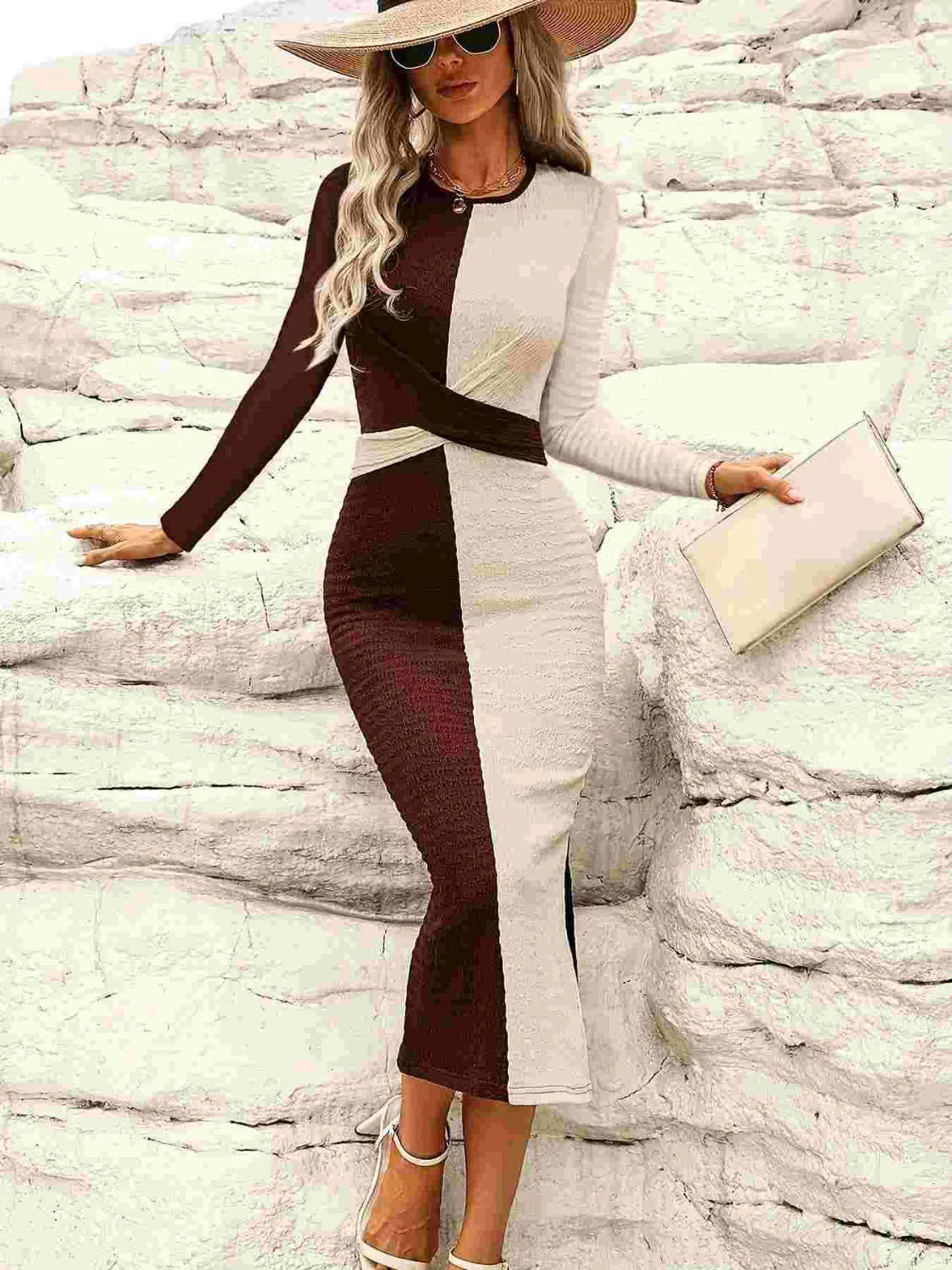 Two Tone Slit Round Neck Long Sleeve Midi Dress